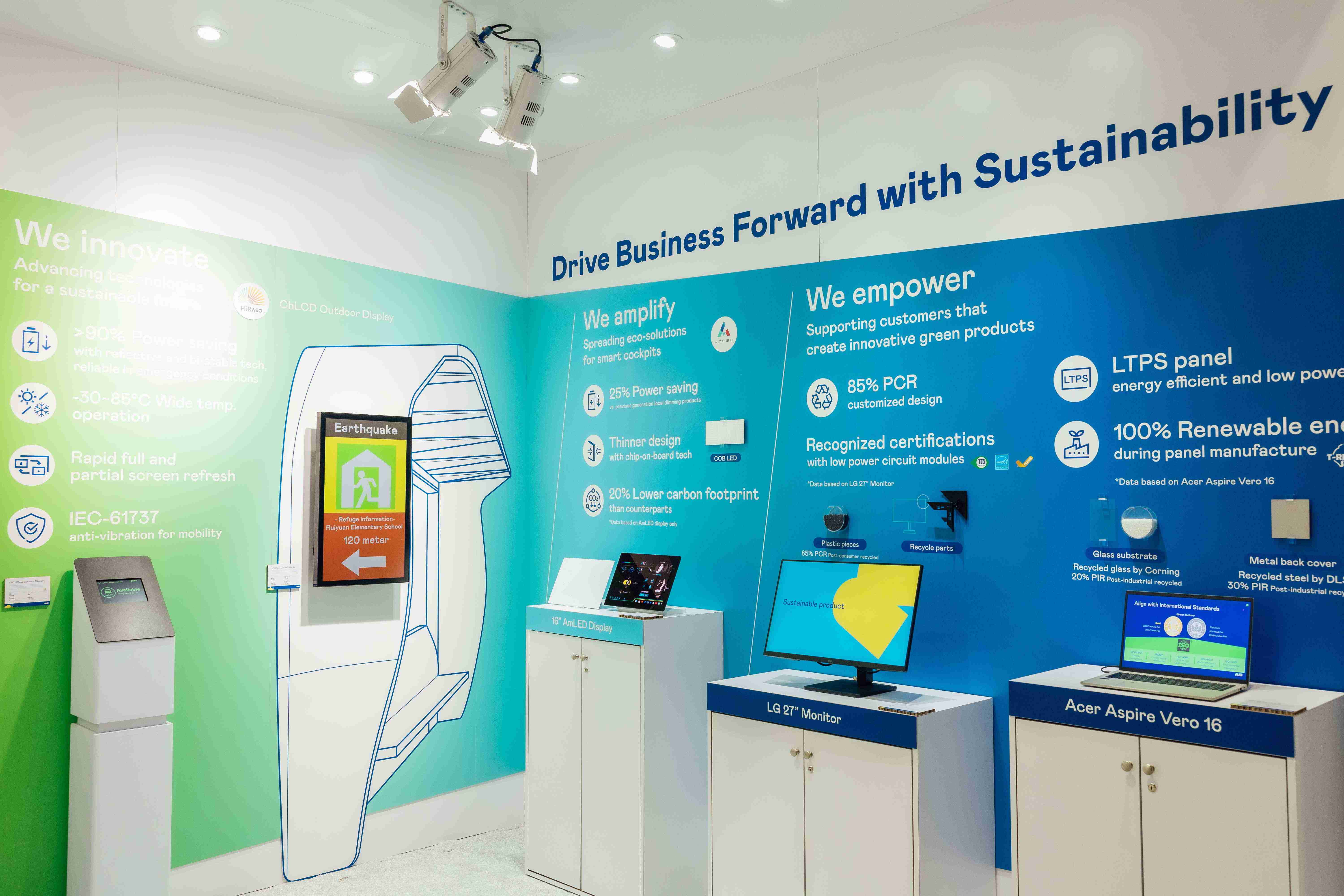 PA直营运用创新显示技术HiRaso胆固醇液晶双稳态技术达到显示零耗能、、、扩大节能省电的AmLED显示技术应用于车用产品、、、、以再生的消费后回收(PCR)塑料及全绿电生产之面板,,,应用于笔电及萤幕,,增加绿色价值。。。