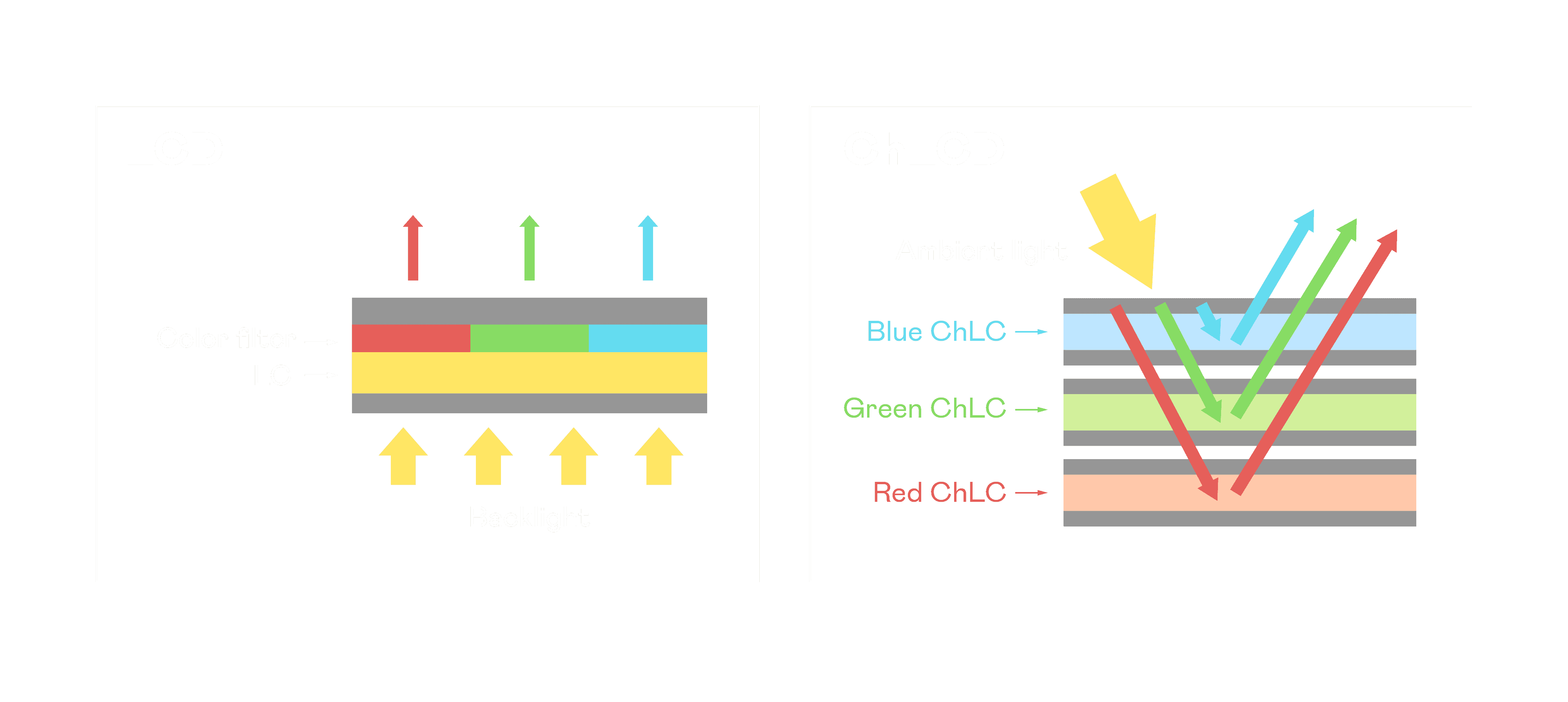 PA直营胆固醇液晶显示器是由红、、绿、、、蓝三层胆固醇液晶面板堆叠而成,,,并采用无彩色滤光片设计,,减少环境光在反射过程中的损耗。。。