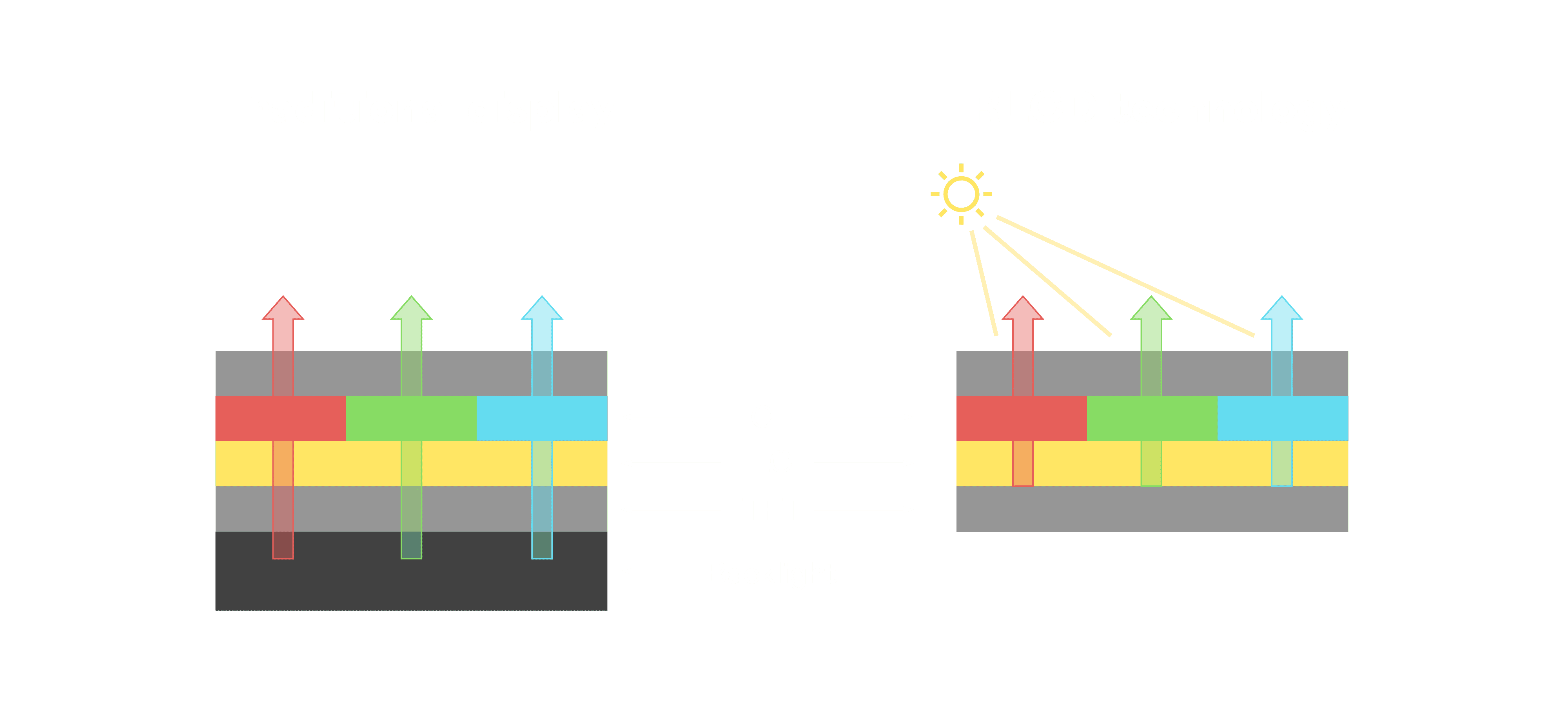 与传统需搭配背光单元的液晶显示相比,,反射式液晶技术不仅更省电、、、更轻薄,,且即便在艳阳下仍能清晰显示。。此外,,少了背光单元,,,也大幅降低了 LED 蓝光伤害眼睛的疑虑。。。。