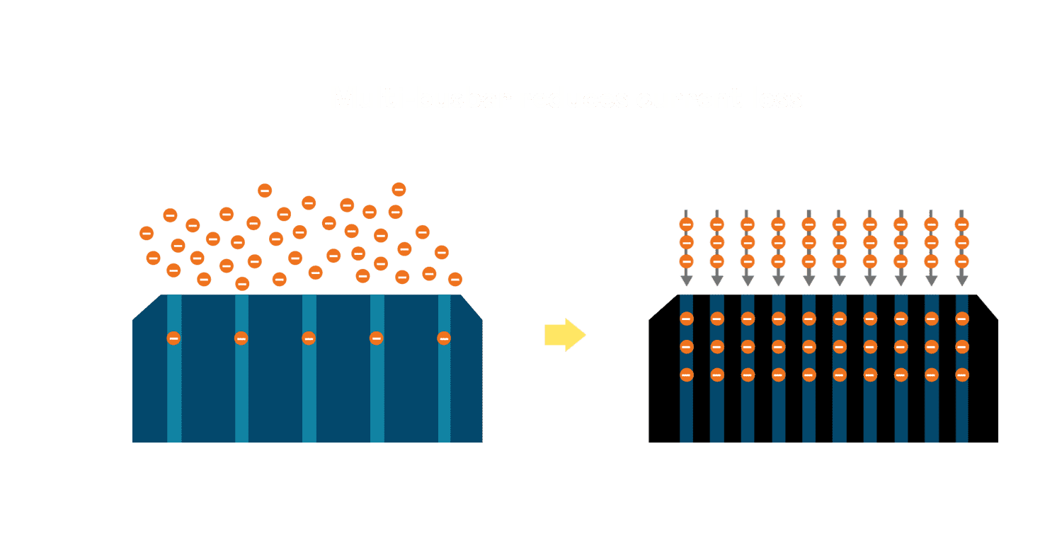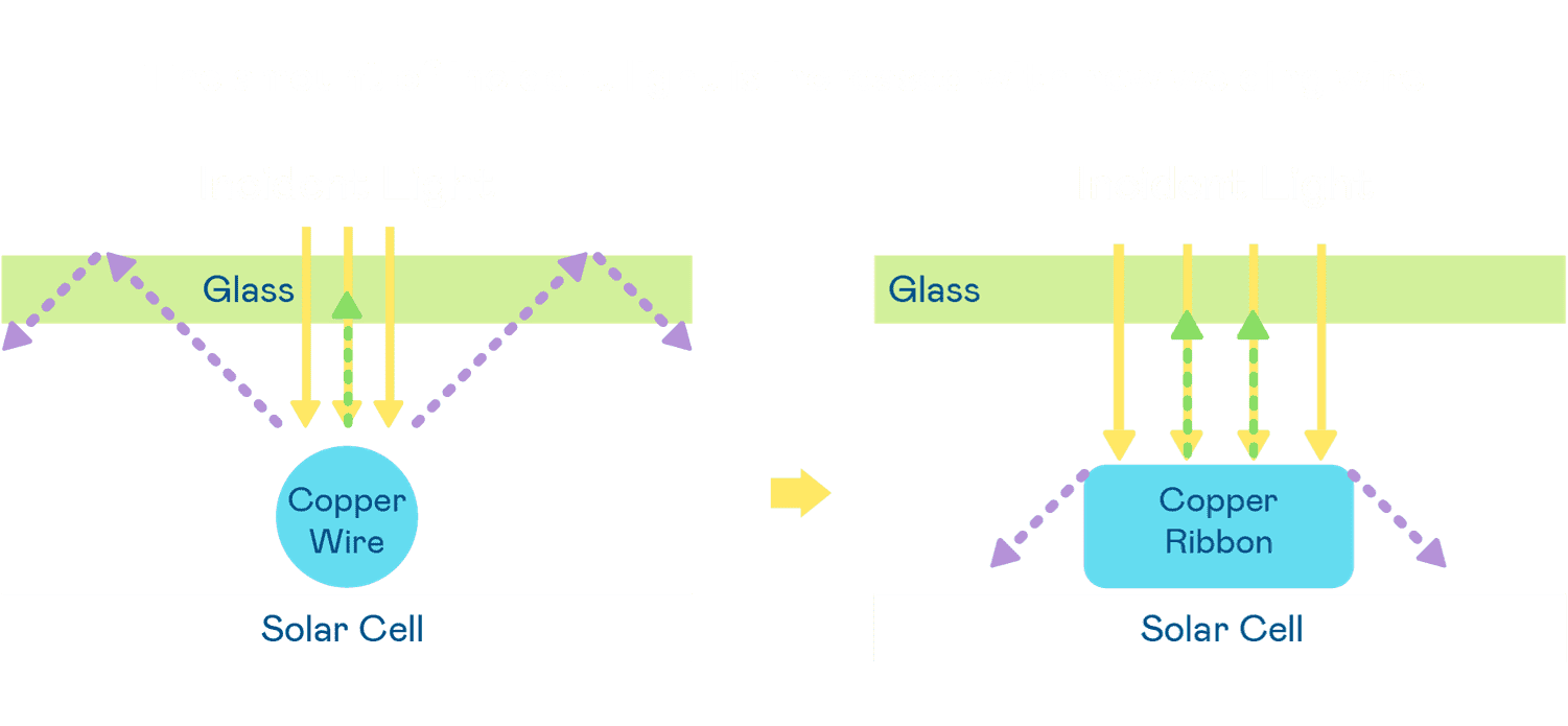 - 电池使用多条铜导线 (Copper wire) 于电池片上形成较短的电流路径,,,提高电流收集效率,,,,采用圆形设计的铜导线较传统扁平式的铜焊带 (Ribbon),,,可增加入射至电池的光线量。。。