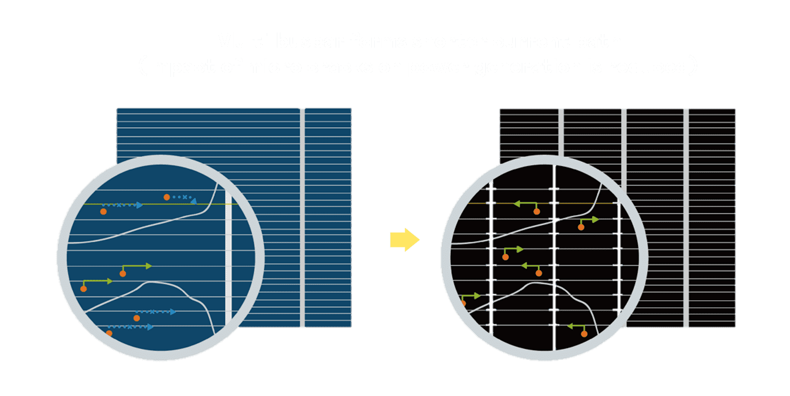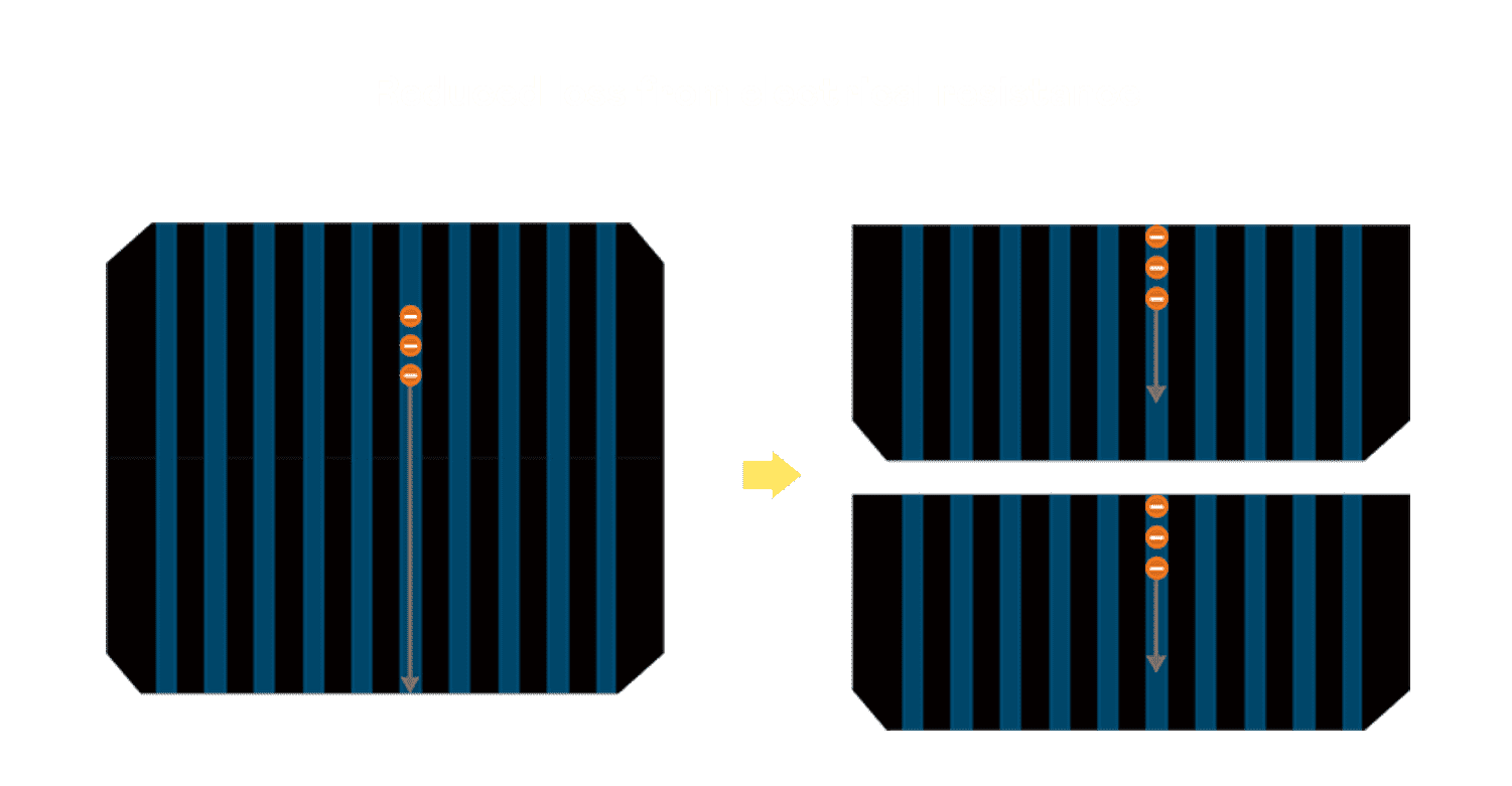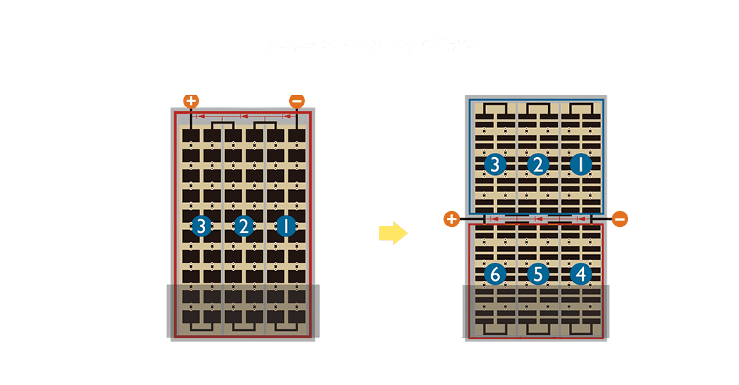 - 结合半切电池,,,,降低遮阴影响、、、提升模组抗隐裂能力、、、、并减少电阻损耗,,进一步提升模组发电效能。。